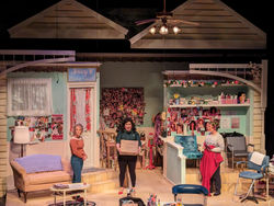 The foundational words for this design were "real" and "feminine." To accomplish the feeling of a fully complete and personal set, clutter in the form of mementos, community fliers, magazine advertisements, and client photos spray across this set. Levels are an essential device I have used in order to give the dialogue-heavy action some movement, setting this "old carport turned salon" lower than usual for this script-which incorporated the unique seating arrangement of this space.